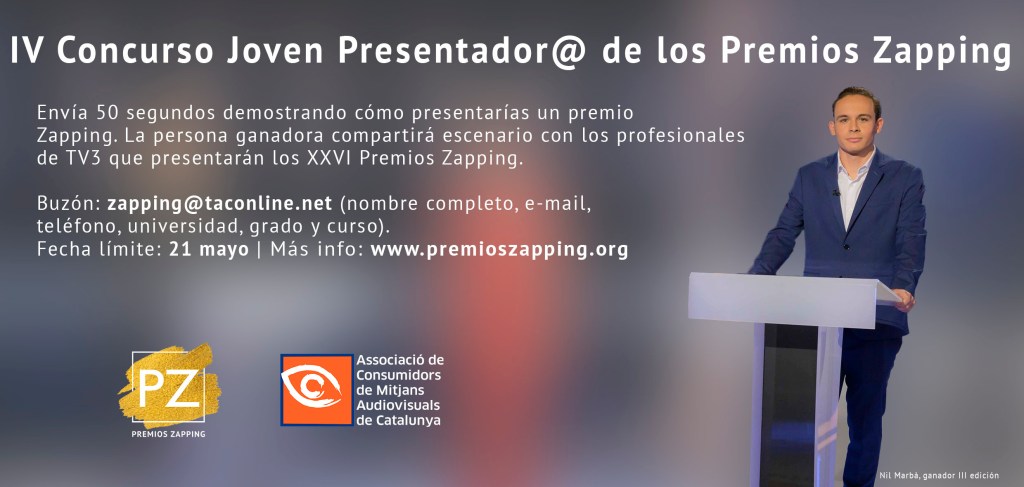 Llega el IV Concurso Joven Presentador@, organizado por la Asociación de Consumidores de Medios Audiovisuales, donde los estudiantes de Comunicación Audiovisual, Publicidad y Periodismo optan a co-presentar la XXVI Edición de los Premios Zapping. La finalidad de este concurso es ofrecer a las nuevas generaciones la posibilidad de presentar una parte de la entrega de galardones, promoviendo así la pasión por el mundo de la comunicación y favoreciendo la participación de los jóvenes en este entorno profesional.