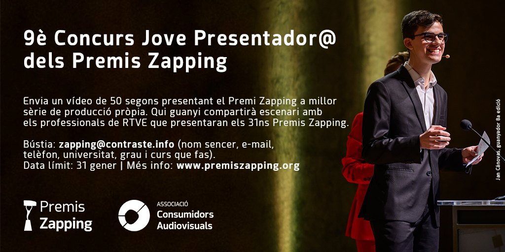 Un año más, la Associació de Consumidors de Mitjans Audiovisuals de Catalunya organiza la novena edición del Concurso Joven Presentador@, donde los estudiantes de Ciencias de la Comunicación pueden optar a copresentar los 31ns Premios Zapping.